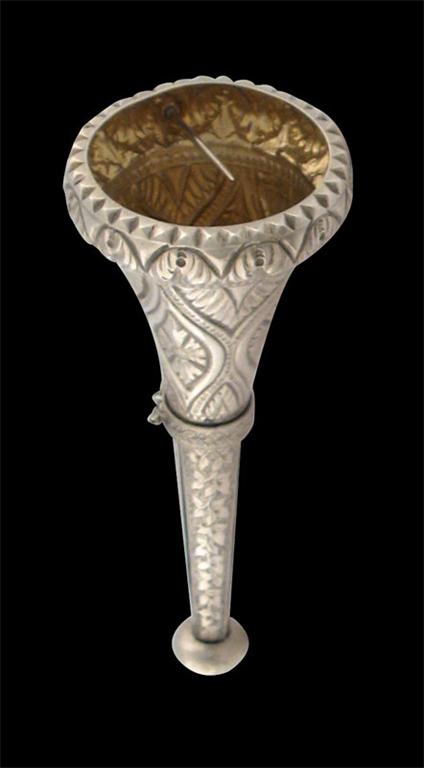 A Victorian posy holder, pierced and engraved with scrolls and the Prince of Wales feathers, between borders of beading, with three sprung loaded legs and a pin on a chain to secure the flower, by C.H.Cheshire, Birmingham 1870, 17cm long, 3oz.