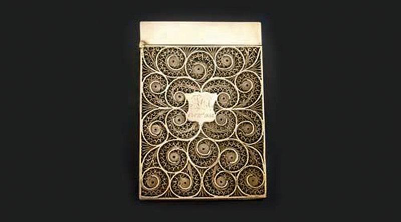 A Victorian card case, with a plain cover and a filigree body with a shield cartouche, applied on one side, initialled 'ADA' and dated 'Oct 11th 1865', unmarked, probably Birmingham-made, c.1840, 9.7cm high, 2oz.