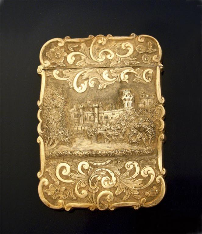 A Victorian embossed 'castletop' card case, depicting a view of Warwick Castle, in high relief, flanked by chased scrolls, by Nathaniel Mills, Birmingham 1845, 9.2cm high, 2oz.