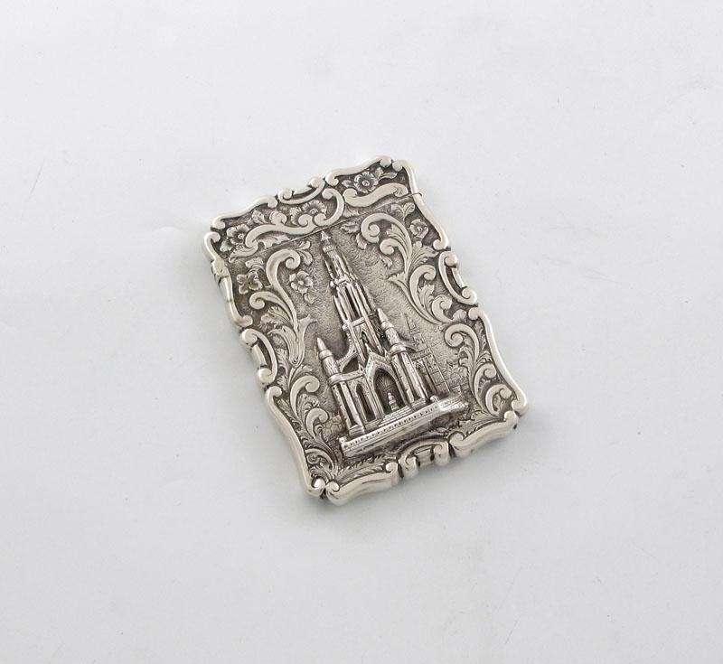 A Victorian silver 'castle top' card case, with a scene of the Scott Memorial, with embossed foliate scroll decoration, and a vacant cartouche, maker's mark worn, Birmingham 1870, length 10cm., approx. weight 1.5oz.