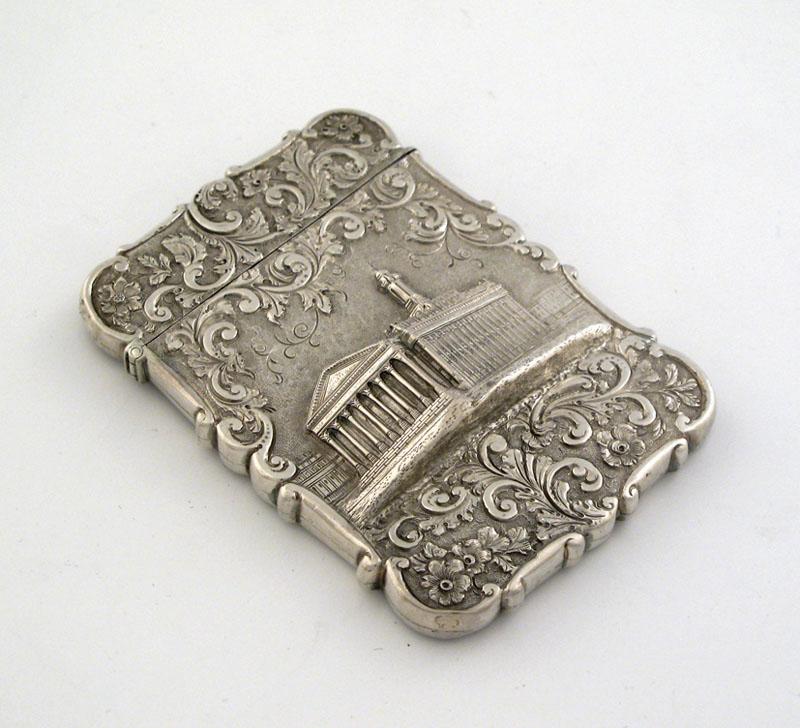 A Victorian embossed 'castletop' card case, with a view of the Royal Exchange in high relief, flanked by chased floral scrolls, the reverse also with scrollwork and central cartouche, initialled by Nathaniel Mills, Birmingham 1844, 10cm high, 2.4oz.
