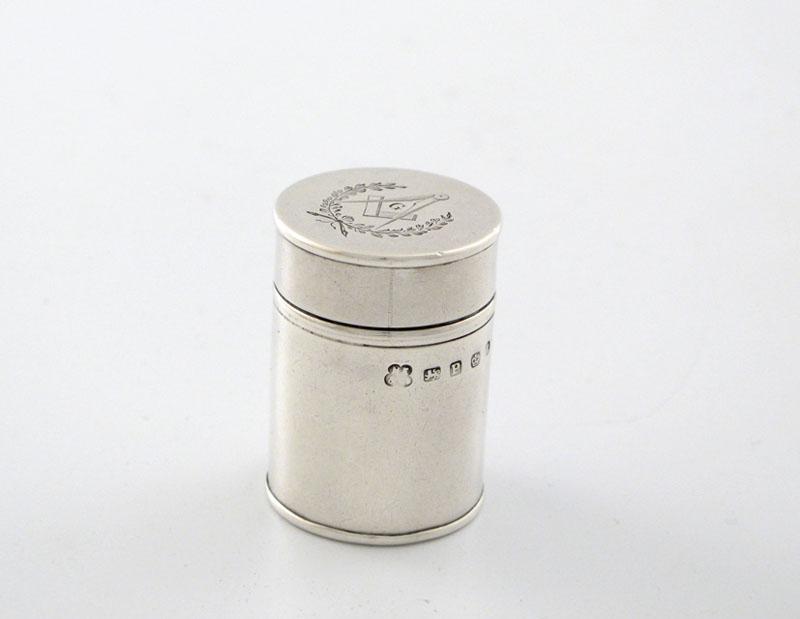 A Victorian silver Masonic silver box, plain cylindrical form, the pull off cover engraved with a Masonic emblem, the base inscribed '125' 'B.D.W' 'Dublin', by Hawksworth, Eyre and Company, Sheffield 1858, height 4.5cm., approx. weight 1oz.