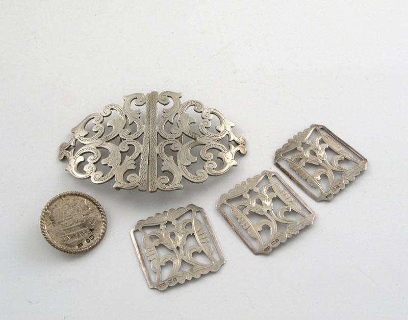 A mixed lot: A modern belt, openwork design, by Samuel and Charles Levi, Birmingham, 1908, another by Arthur John Smith, Birmingham 1910, a nurses buckle, by Saunders & Shepherd, Birmingham, 1923, and six continental buttons, with nautical scenes on each, approx. weight 7oz in total