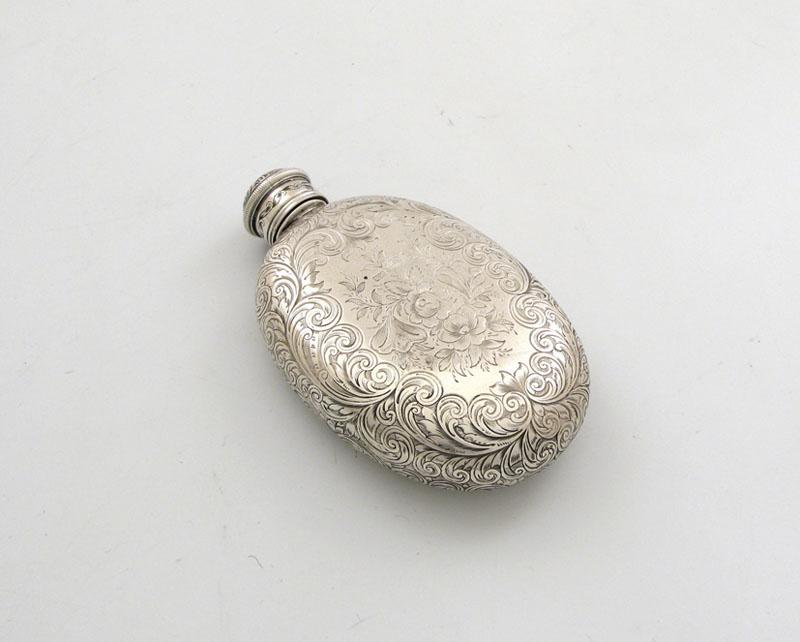 A Victorian silver hip flask, of oval form, engraved foliate scroll decoration, screw cover, by Thomas Whitehouse, London 1866, length 10.3cm.
