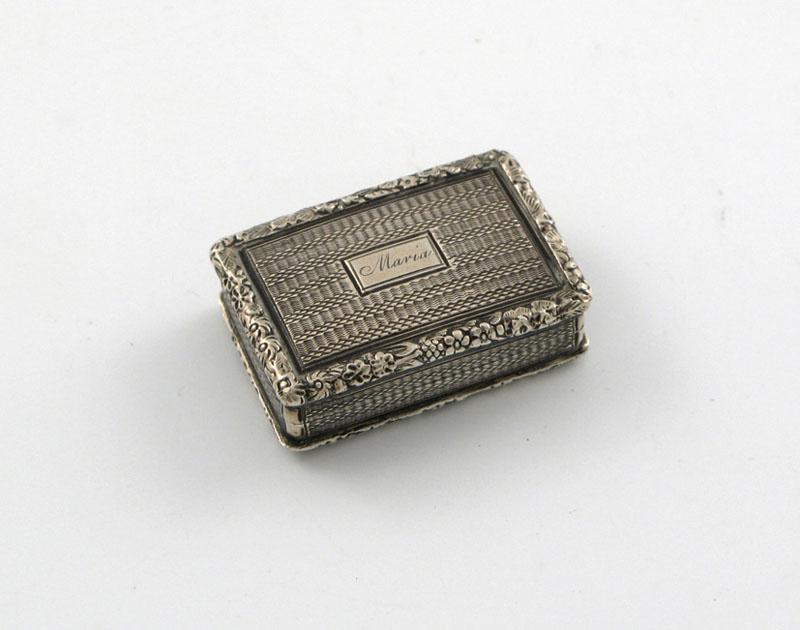 A George III vinaigrette, with raised floral borders and engine turned decoration, oblong central plaque engraved 'Maria', gilt interior, pierced grille, by John Bettridge, Birmingham 1827, 1.6in (4cm) long.