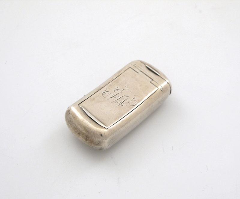 A George III combined snuff box vinaigrette, rounded, curved, oblong form, hinged cover, initialled 'J W', gilt interior, by Matthew Linwood, Birmingham, 1809, 5.8cm long.
