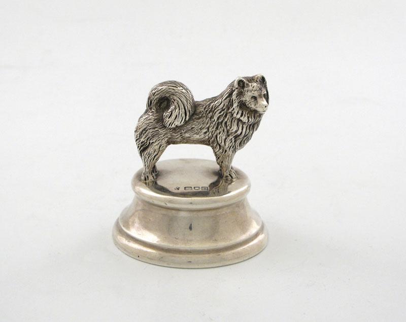 An Edwardian silver novelty dog paper-weight, the standing Samoyed dog, mounted on a circular base, by Charles Boyton and Sons, London 1907, height 8cm.