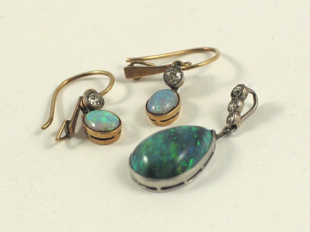 A pendant set with a pear shaped solid black opal, suspended from three small graduated diamonds, on a fine link neck chain, set with seed pearls and a pair of gold earrings each set with an opal and diamond.