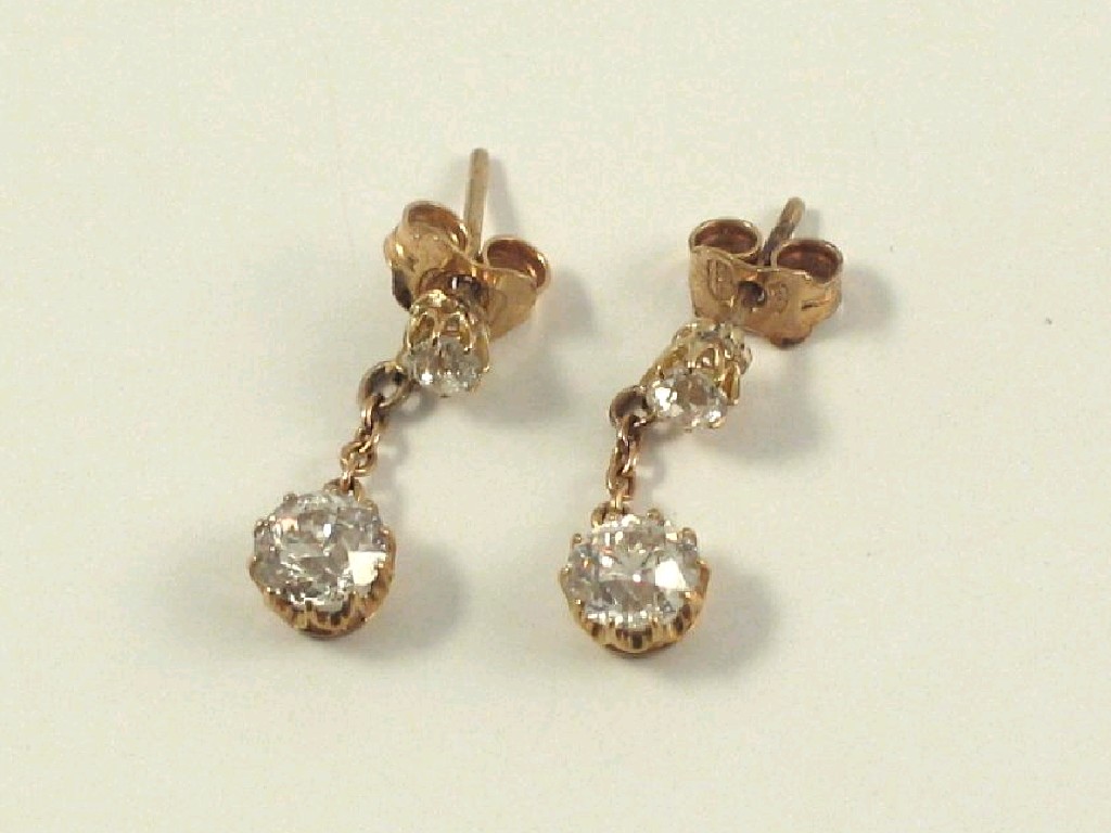A pair of diamond two stone pendant earrings, each with a single old mine cut diamond estimated to weigh approximately 0.5 carats suspended from a chain and a smaller single stone diamond top, mounted in gold, post fittings.