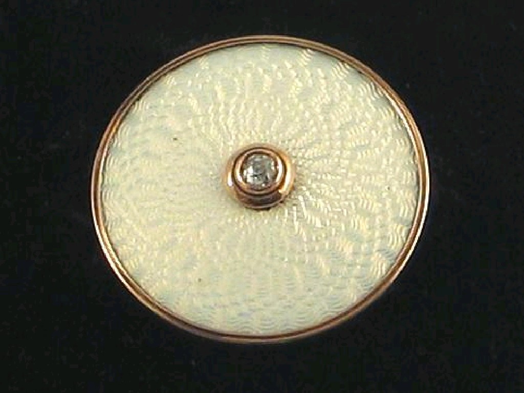 A Russian enamelled brooch, enamelled in translucent white to a guilloche ground, with a central old mine cut diamond collet, the reverse bearing a '56' gold standard mark, further marks to the pin fitting, case by Tessier.