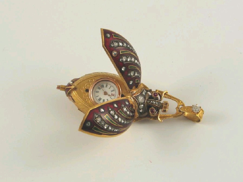 A Swiss gold and gem set fob watch, in the form of a beetle, realistically formed with push button action to release the spring loaded wings, with ruby eyes, and rose cut diamonds, set overall and the wings decorated with green and red guilloche enamel, the underside realistically engraved, the hinged under section opens to reveal the glazed movement and locket compartment, stem winding and with circular cut diamond set to the pendant loop, 7cm long.
