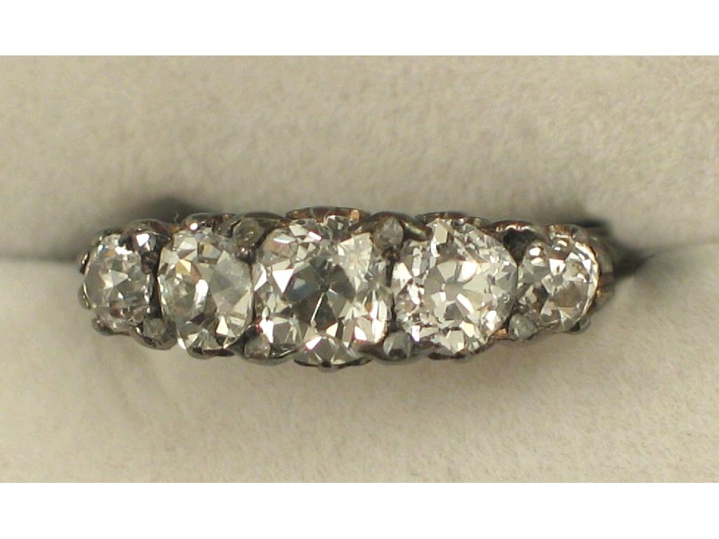 A late 19th century diamond five stone ring, set with five graduated circular cut diamonds, with rose cut diamond pointers (one missing), to the carved gold shank.