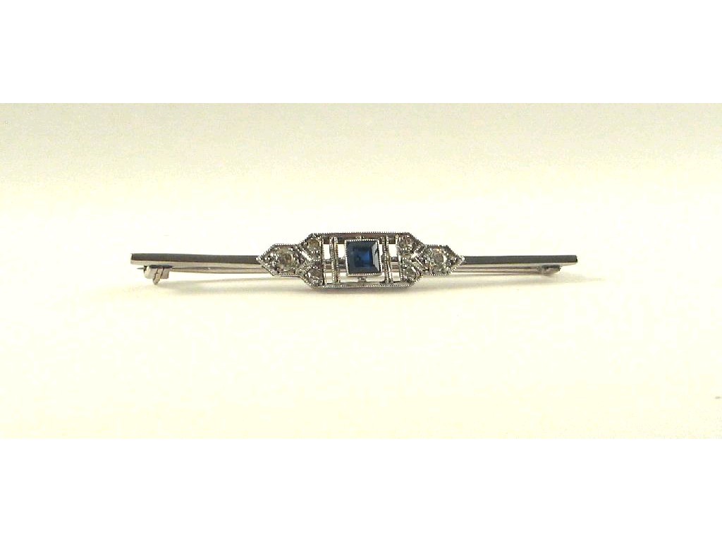 An Edwardian diamond and sapphire brooch, the stones set in a geometric frame on a bar, mounted in white precious metal.