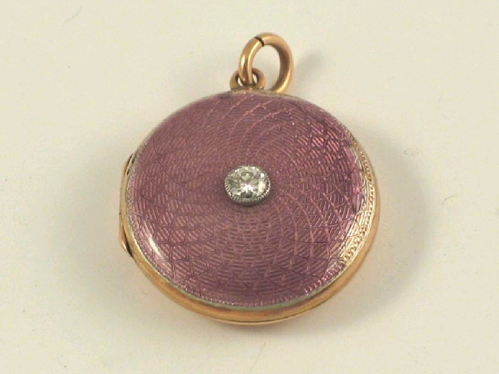 A gold violet enamelled circular locket pendant, set to the centre a diamond collet. Damages.