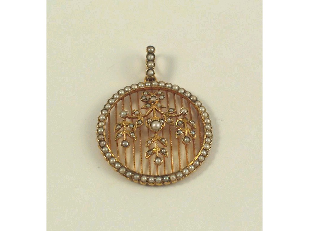 A circular gold pendant c.1900, the centre a half pearl set garland against a knife wire grille within a border of half pearls, similarly set suspension loop. 4.2cm