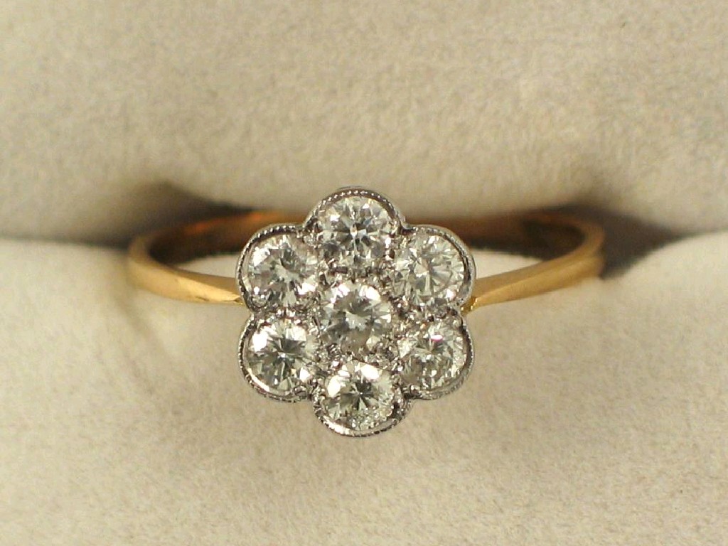 A seven stone diamond cluster ring, the brilliant cut diamonds set in white and yellow precious metal, stamped 18ct.