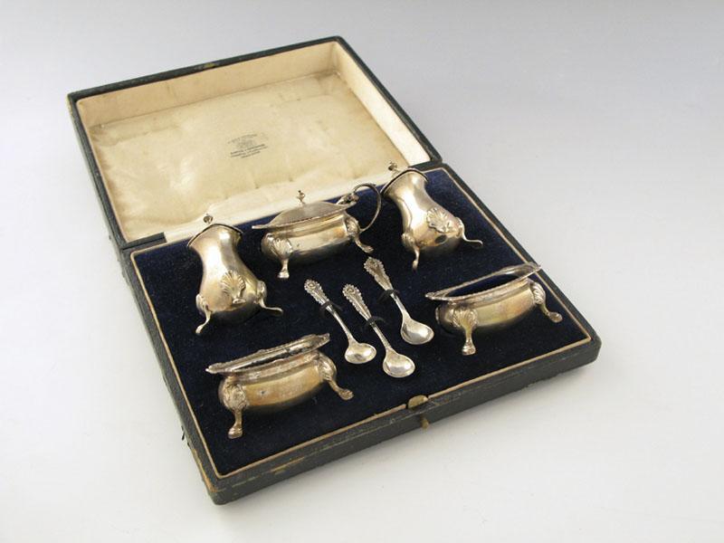 A five-piece silver condiment set, oblong bellied form, on four hoof feet, with spoons, by the Barnards, Birmingham 1915,1919 and 1920, in a fitted case.