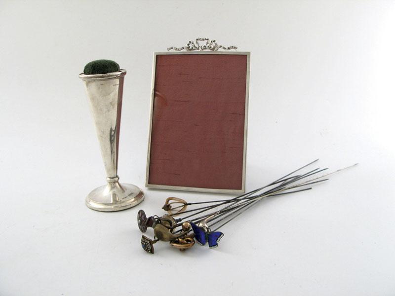 A mixed lot including: a large quantity of assorted hat pins, a hat pin holder, Chester 1908, a circular frame, London 1908, a rectangular frame with bow surmount, Birmingham 1928, a modern candlestick, by Simon Jonathan Beer, Sheffield 1994, eight cased cheroot holders (and two empty cheroot cases), a bangle, a brooch, stickpin, brass frame, modern coins, three dip pens, a fan and three modern cartridge pens. (lot).