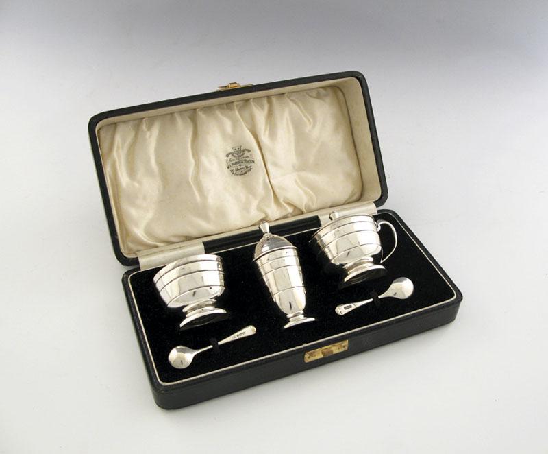 A three-piece silver Art Deco condiment set, of tapering circular form, with blue glass liners and with two condiment spoons, by The Adie Brothers, Birmingham 1934 and 1935, in a fitted case.