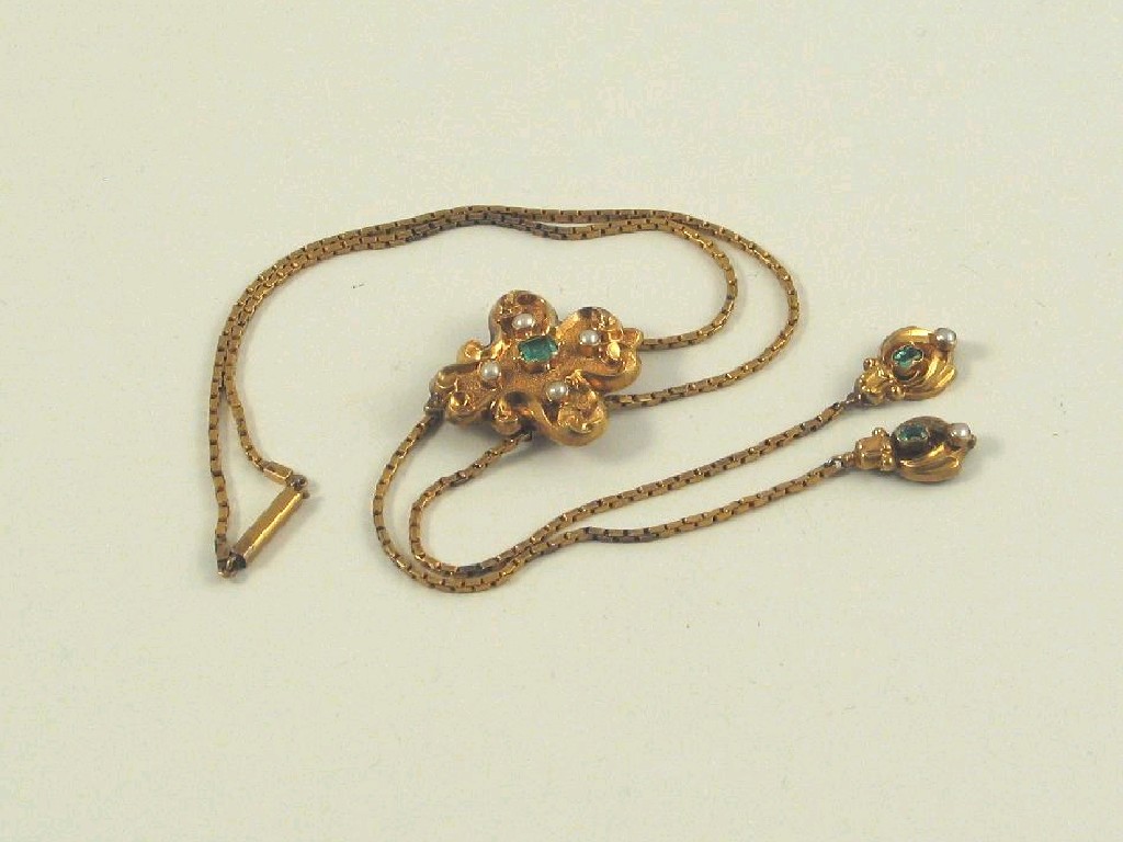 A 19th century continental gold necklace, of a box link chain with a quatrefoil locket back slide, set a step cut emerald and half pearl collets on a matt ground to scroll borders, the chain terminals similarly set.
