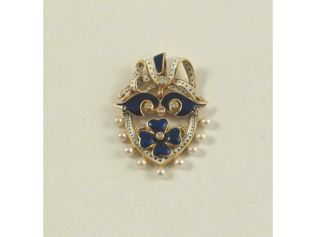 An enamelled gold, pearl and diamond pendant, in the form of a heart with a tied bow surmount, enamelled in blue and white, with a pearl border and diamond collet highlights, from an enamelled blue suspension loop. 3.8cm max.