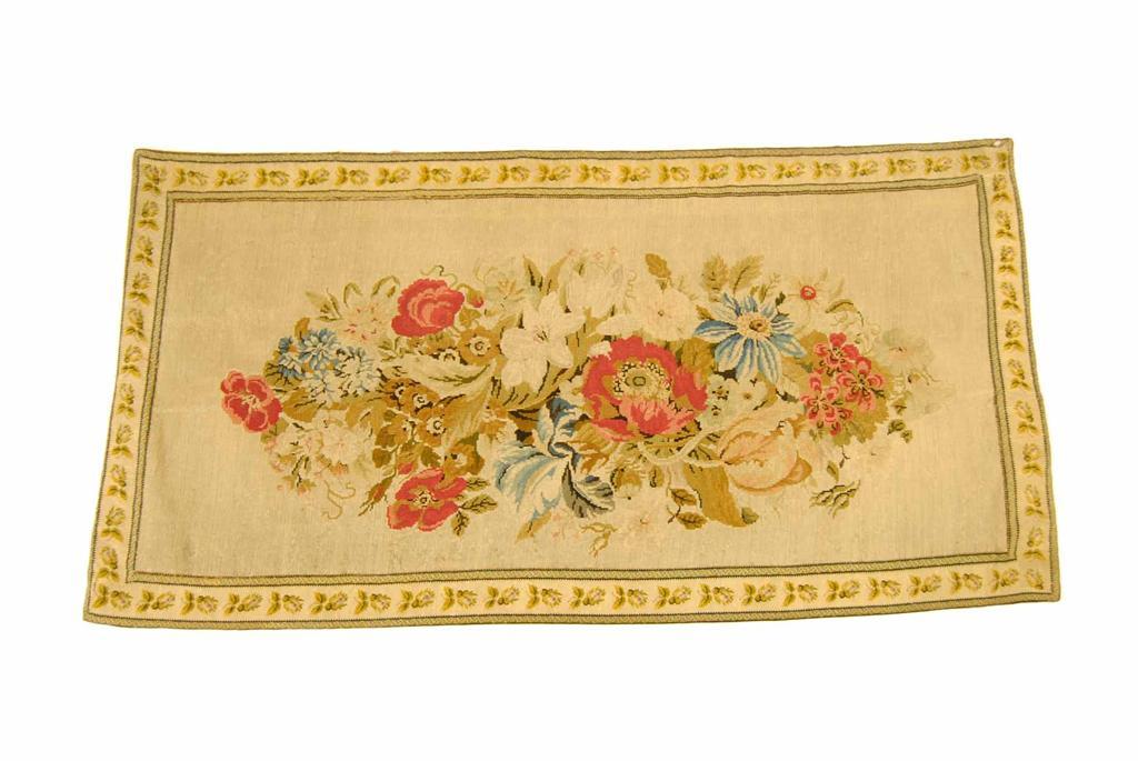 A 19th century embroidered wall hanging, centred a floral bouquet, having a flower head border, 31.5 x 59in (80 x 150cm).