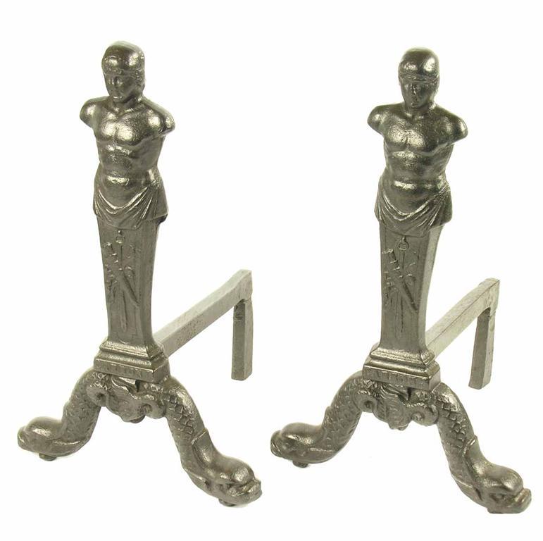 A pair of Scottish cast iron andirons by the Carron Foundry