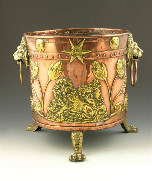 A late 19th century copper log bin, with applied embossed brass decoration of lion and serpent, foliage, rondels and stars with lion mask wing handles and claw feet, with liner 14.25in (42.5cm) h, 16.5in (42cm) w.