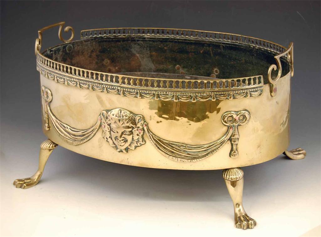 An early 19th century brass jardiniere, with a pierced gallery and twin handles to on oval body decorated with a Pan mask flanked by ribbon tied swags, on paw feet, with a lift-out liner, 10.25in (25.8cm) h, 19.5in (49.4cm) w, 15in (37.8cm) d.