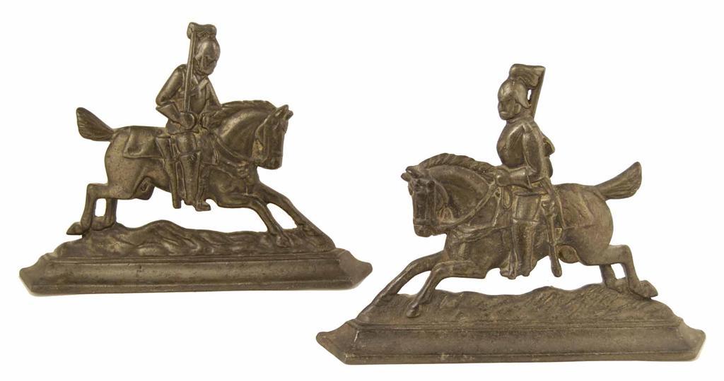 A pair of cast iron door stops, mounted cavalrymen, 9.5in (24cm) h. (2)