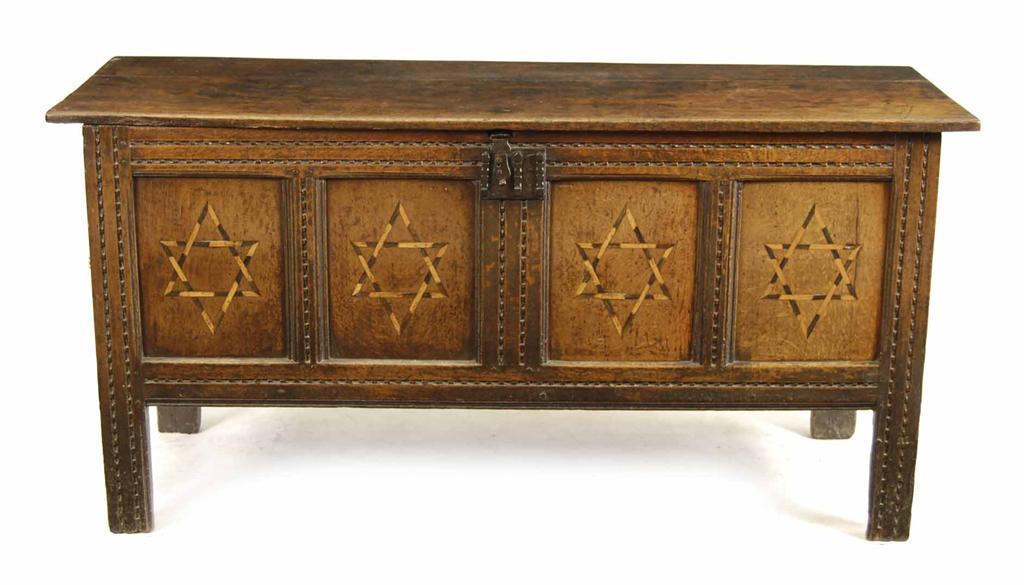A late 17th century joined oak chest, the hinged top to a reconstructed till, the sides with later hinged doors, to a quadruple panelled front inlaid parquetry stars, 30.5in (77.5cm) h, 61.75in (156.5cm) w, 21.25in (53.6cm) d. Later hinges and lock, later bearers to lid.