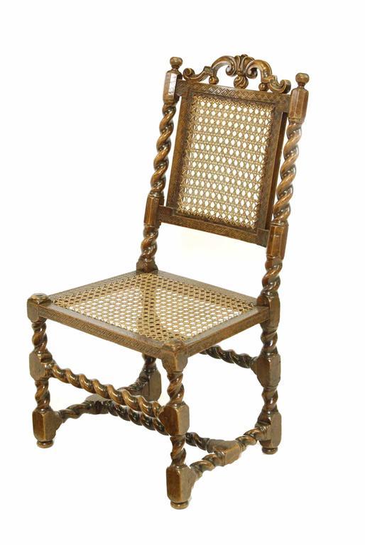 A walnut backstool, the scroll cresting to a caned back and seat, on block and spiral twist stretchered supports, late 17th century and later.