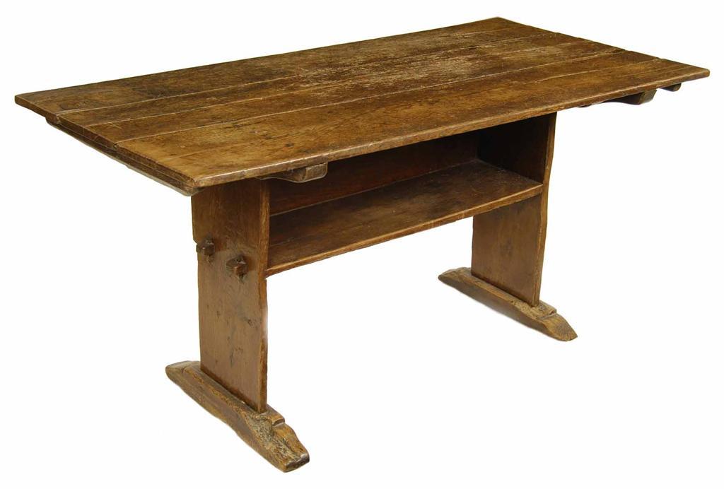 An oak bench table, with a pivoted hinged triple boarded top on trestle supports, with a low back seat stretcher, 17th century and later, 29in (73.5cm) h, 57.75in (146.5cm) w, 29.25in (74cm) d. The top is secured by a sliding catch.