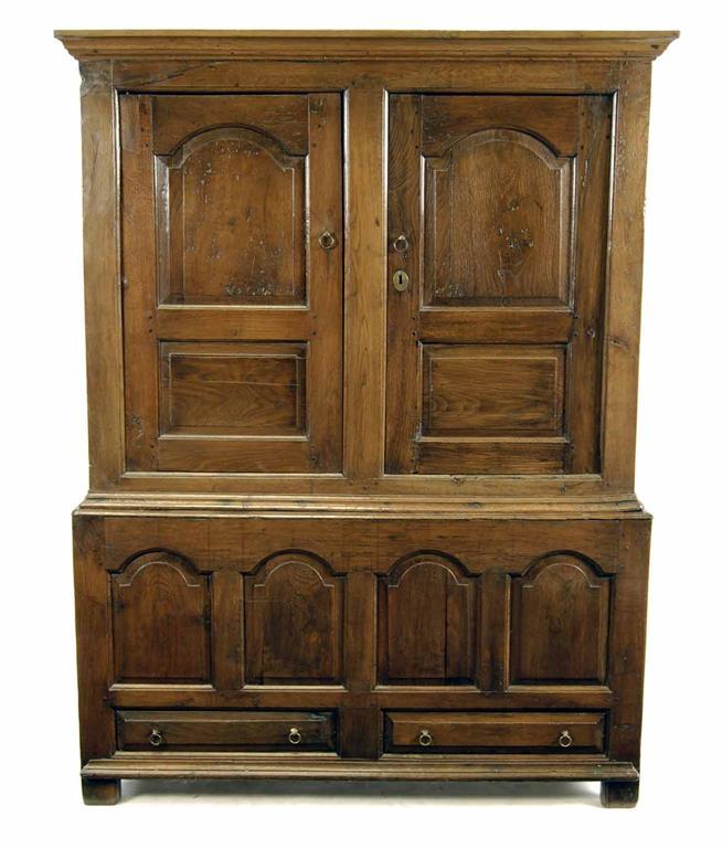 A Welsh oak press cupboard, the moulded cornice above a pair of fielded panel doors enclosing a later rail, the base with quadruple arched panels above two drawers, mid 18th century and later, 71in (180.6cm) h, 53in (134.5cm) w, 19.75in (50.2cm) d. Top and back boards replaced.