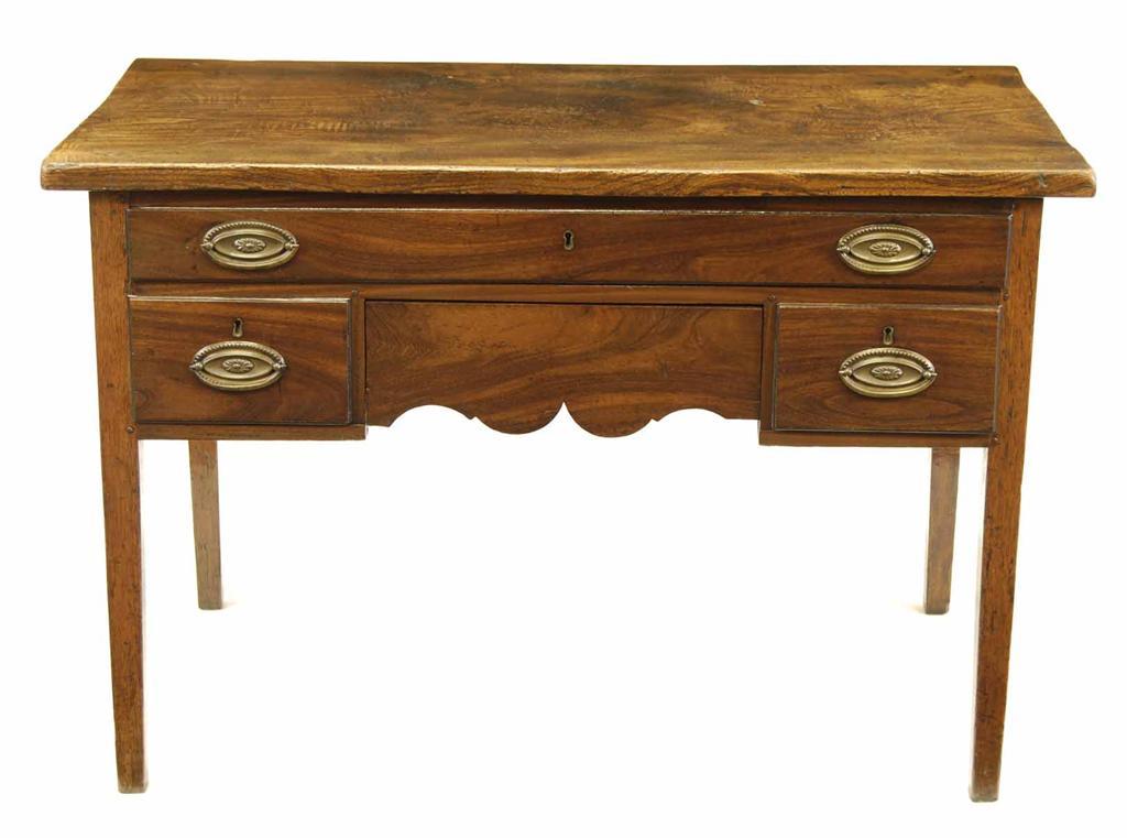 A George III elm and fruitwood side table, the single plank top above a long frieze drawer and two short drawers flanking a shaped apron which has been later converted into a drawer, on square tapering legs, 30.5in (77.5cm) h, 46in (116.5cm) w, 24.75in (62.6cm) d.
