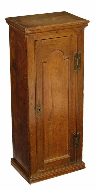 An oak narrow cupboard, the arch panelled door enclosing two shelves, incorporating antique elements, 33.75in (85.5cm) h, 14.25in (36cm) w, 9.75in (25cm) d.