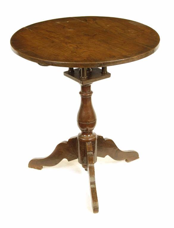 An oak tripod table, the circular tilt-top revolving on a birdcage, on a baluster turned stem and shaped scroll legs, early 18th century and later, 25.5in (65cm) h, 24in (61cm) dia.