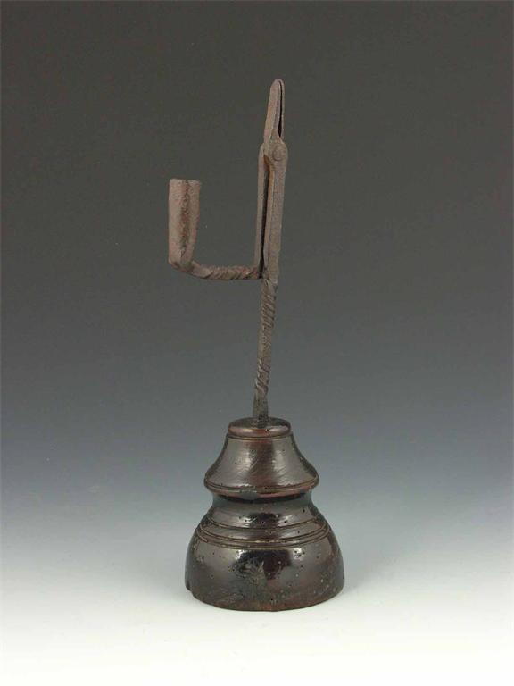 An 18th century wrought iron rush light, with a turned wood base, 12.5in (31.7cm) h.