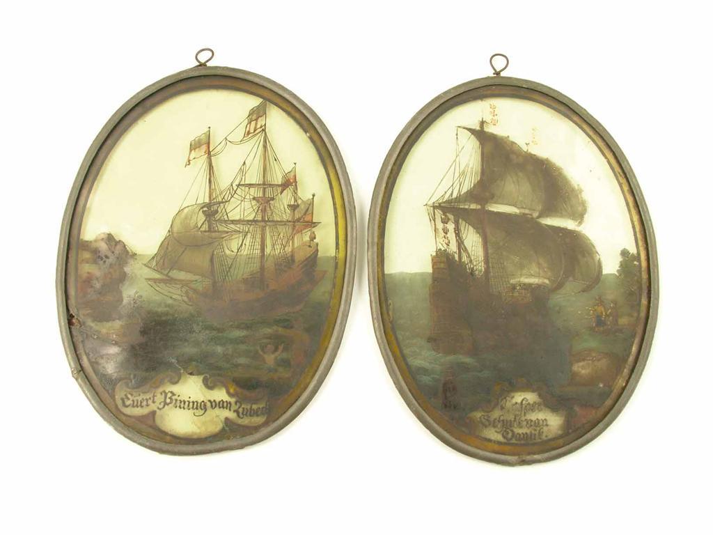 A pair of German oval stained glass panels