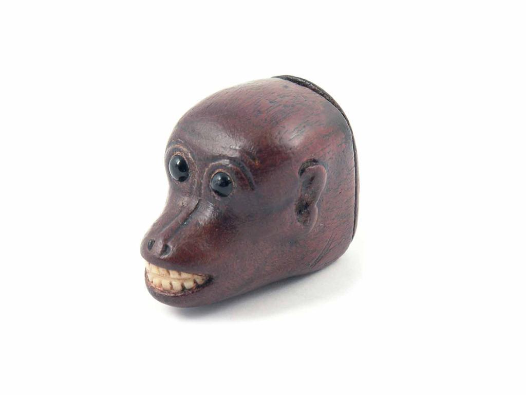 An 18th century carved treen snuff box, modelled as a monkey's head, with applied bead eyes and bone teeth, with a hinged cover, 2in (5cm) l.