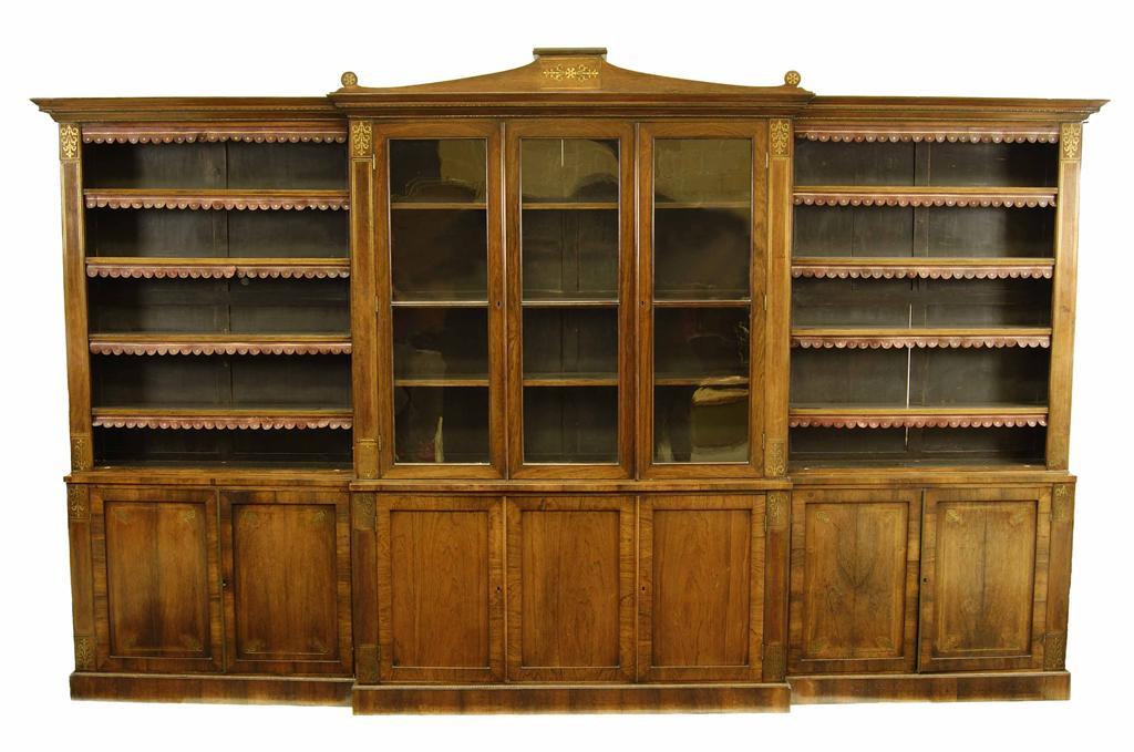 An early 19th century rosewood and brass inlaid breakfront bookcase