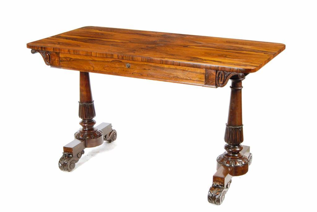 A William IV rosewood library table, the rectangular top above a frieze drawer fitted a later brass Bramah lock, the drawer stamped 'KERBY, 545 NEW OXFORD STREET', on turned and leaf carved supports and scroll feet to brass castors, 28.75in (73cm) h, 50in (127cm) w, 25.75in (65.2cm) d. Base of drawer replaced.