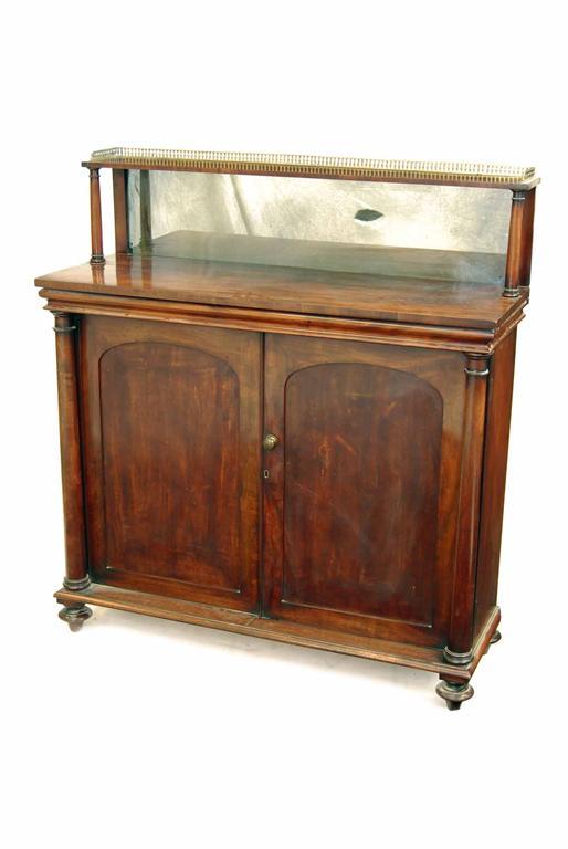 An early Victorian mahogany chiffonier, the raised mirrored back with a brass gallery, above a pair of arch panelled doors enclosing two adjustable shelves, 4.25in (122.4cm) h, 44in (111.7cm) w, 16in (40.2cm) d.