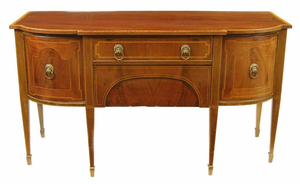 A late Victorian mahogany breakfront sideboard, satinwood banded and inlaid stringing, the frieze drawer baize lined for cutlery, the right hand cupboard with a revolving four division bottle coaster, the top previously with a rail, 36in (91.5cm) h, 64in (162.5cm) w, 26in (66cm) d.