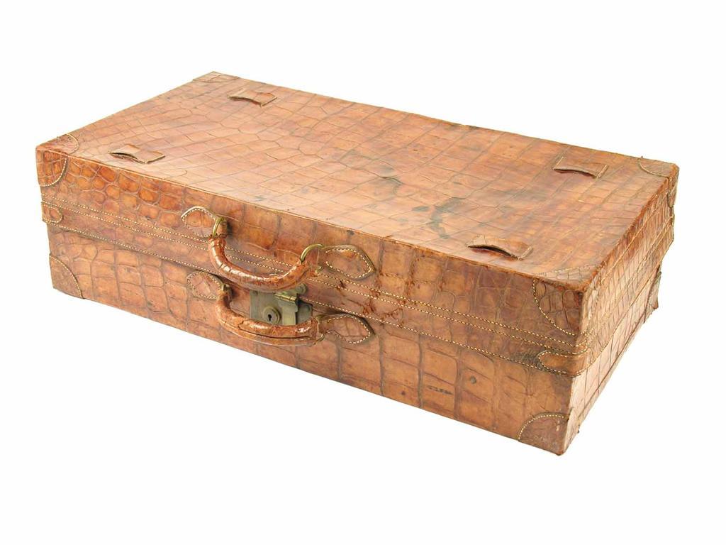A large crocodile suitcase, having two handles and a divided canvas interior, with leather straps, with a stamped plaque inscribed 'TALABARTERIA DE J.J. MARTINEZ. A MANAGUA.NIC', 30.25in (76.8cm) w. Previously with outer straps.
