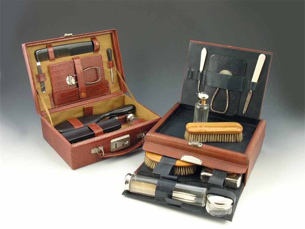 A faux crocodile travelling toilet case, with a fitted interior including a mirror, ebony handled brushes and chromium topped glass bottles, 10in (25.5cm) w, and a leather gent's toilet set, with a hinged cover containing a mirror and two implements, the base with a pull-out slide fitted with brushes and bottles. (2)