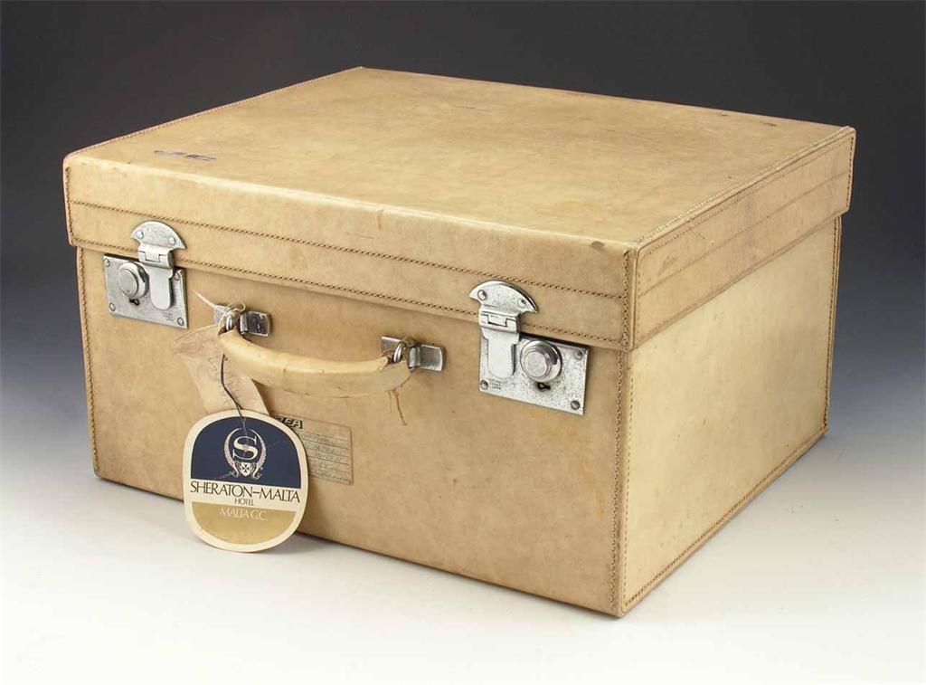 A vellum suitcase, the top applied with initials 'J C', with a suede interior, 18in (45.7cm) w.