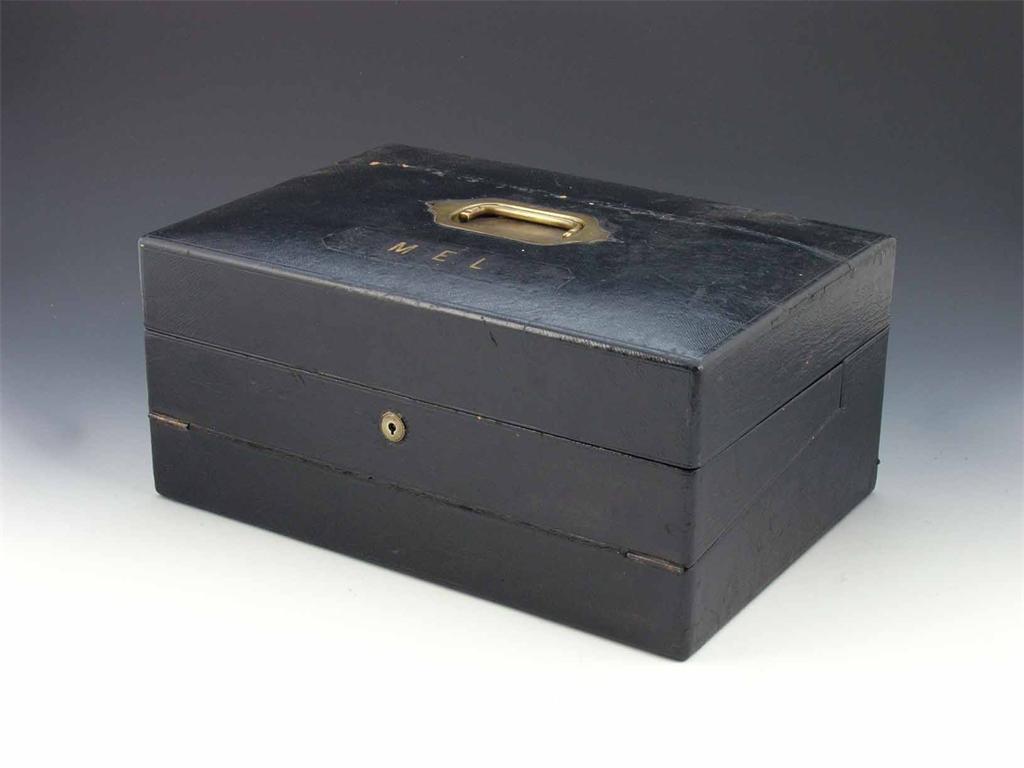 Asprey. A green leather writing case, with a sunken brass handle and applied leather panel stamped 'M.E.L.', to a folding fitted interior, with a spring release stationery envelope, to a pen tray having ink and light boxes and inset ceramic writing surfaces, gilt stamped and the brass lock stamped 'ASPREY, 166 BOND ST', 16in (40.5cm) w. Top repaired.