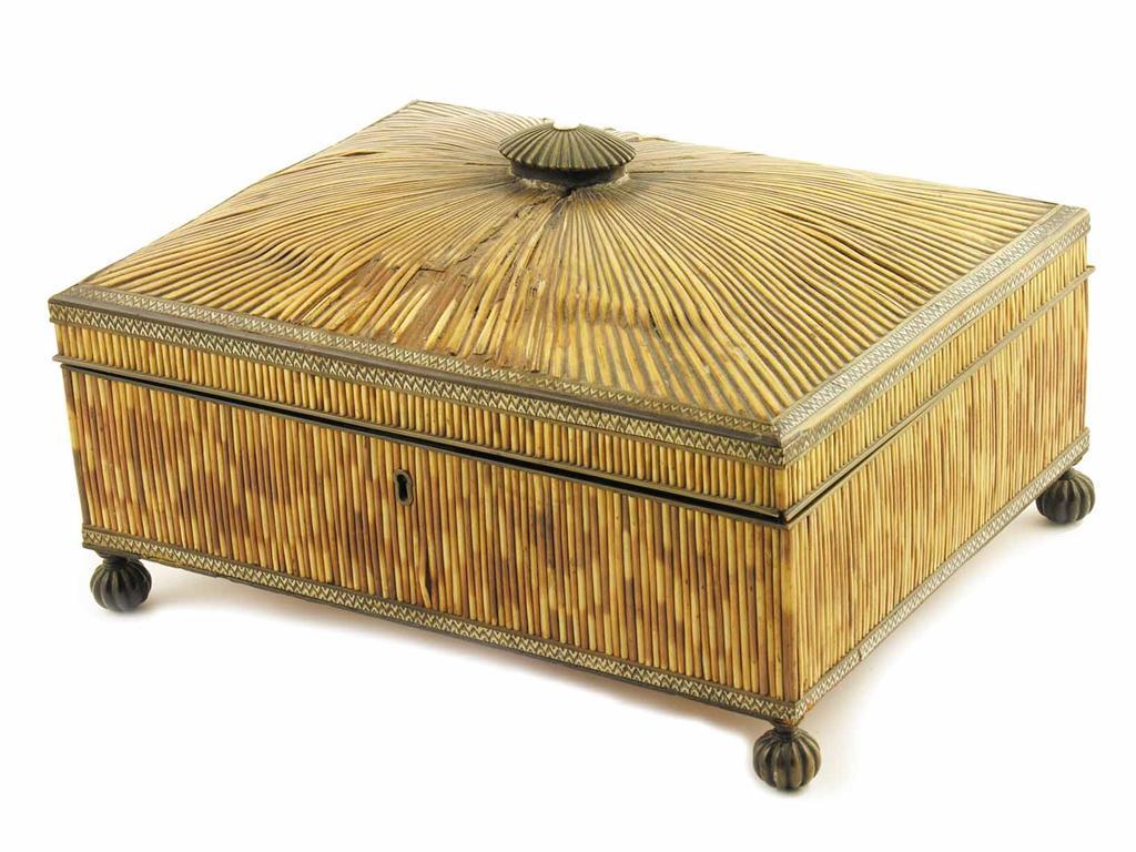 A 19th century Anglo-Indian work box, Vizagapatam, of sandalwood with porcupine quills, lac decorated ivory and horn, the hinged lid with a hinged door, to a lift out tray with lidded compartments, a horn tape measure holder and a thimble, on ribbed horn feet, 7.5in (19cm) h, 12.75in (32.5cm) w, 9.75in (24.5cm) d.