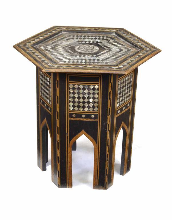 A Moorish octagonal occasional table, inlaid stringing and mother of pearl, 19.75in (50cm) h, 21in (53cm) w. Old worm holes and losses to inlay.
